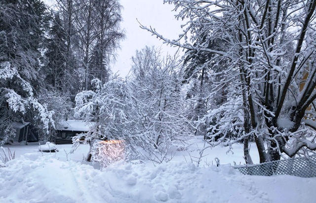 Lauantain lumipyry maalannut kauniin taulun ikkunani taa |