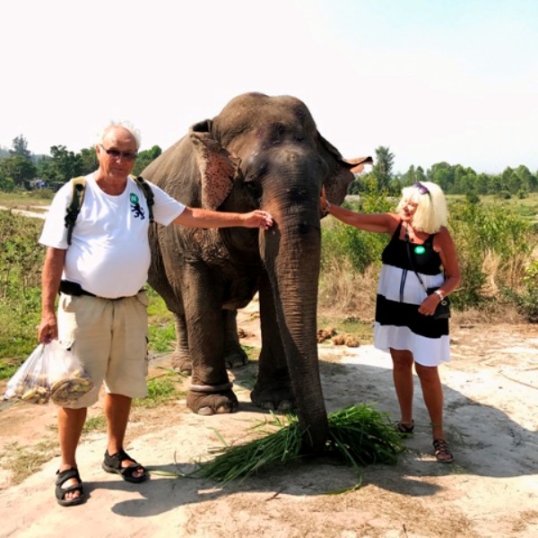 Norsujen hoitokodissa **kävelyllä vanhan rouvanorsun kanssa